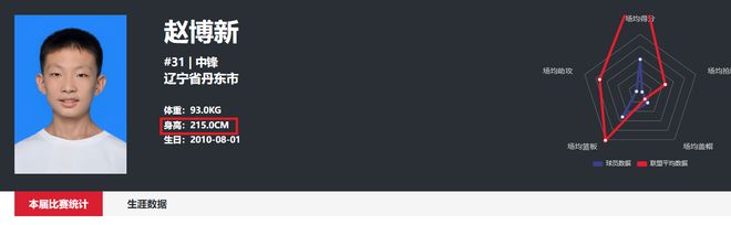 2025全國男籃U17聯賽上,15歲的清華附中新星趙博新有著出色的表現,以場均得到2.3次蓋帽加冕聯賽蓋帽王。根據中國籃協官網的最新數據,趙博新的身高已經長到了2米15,他在繼續長高當中。最近兩年,他的個子長得太快了。