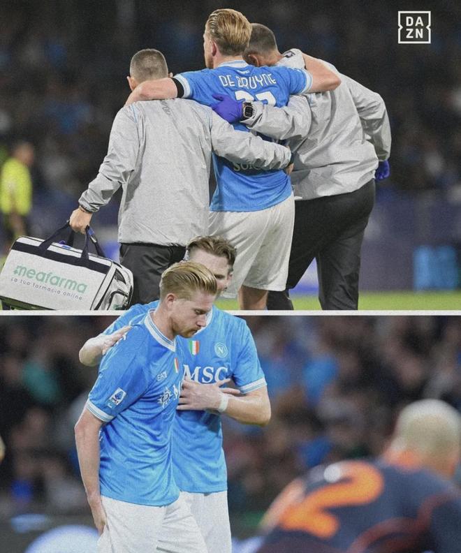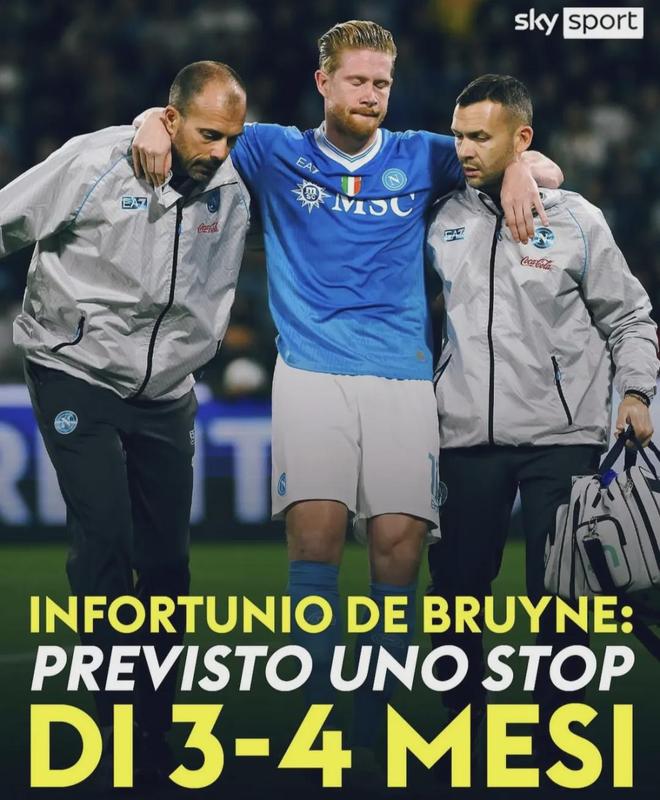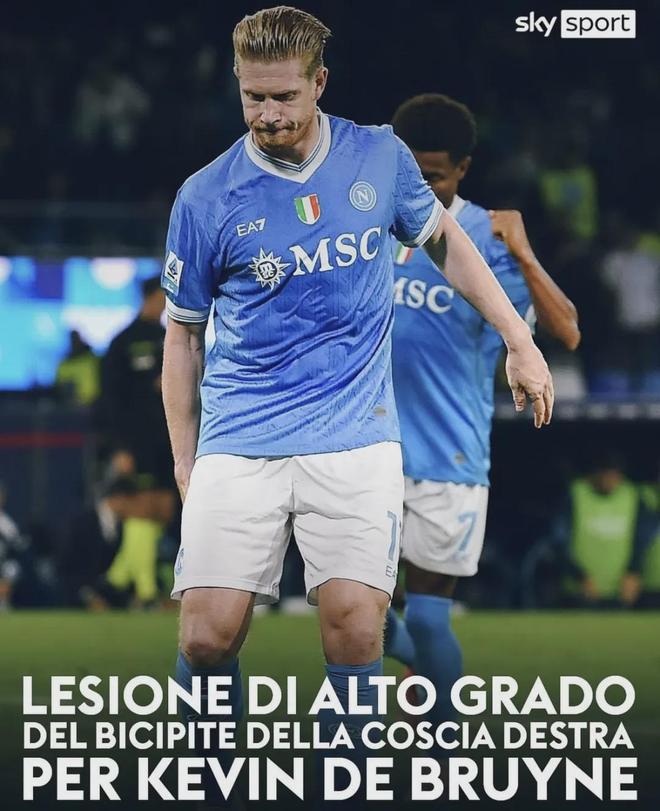 意甲領頭羊那不勒斯官方宣布,球隊中場核心德布勞內右大腿股二頭肌重度損傷,據悉,球員至少缺陣3個月。